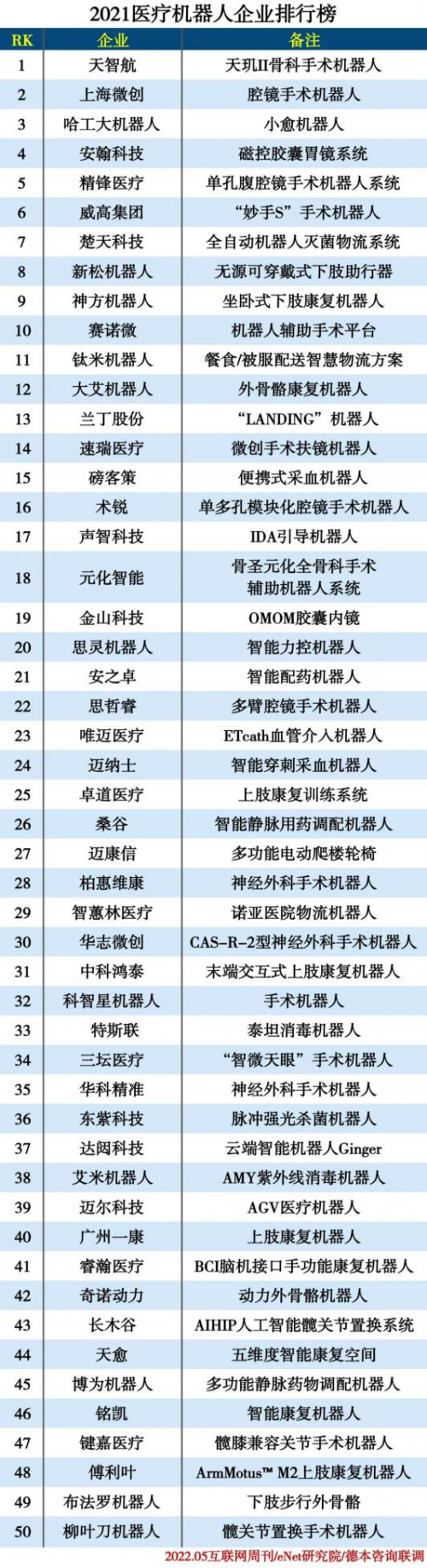 2021医疗机器人企业排行榜公布